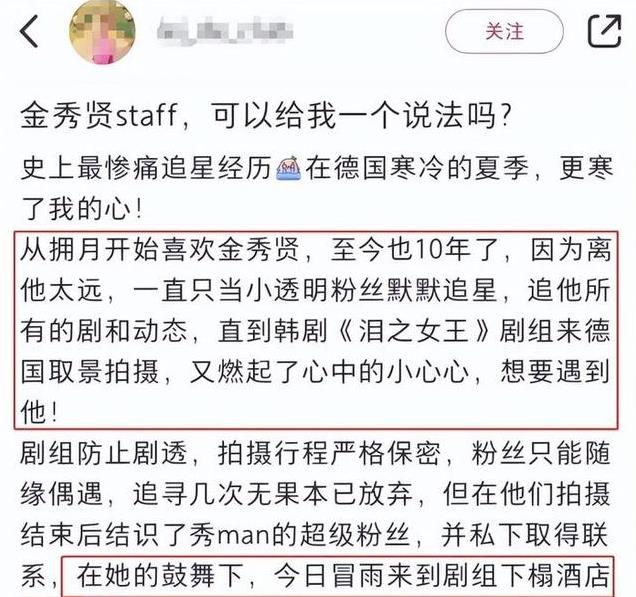 有中国粉丝不远千里来到他的剧组拍摄地,希望能够亲眼见到偶像一面,却遭到了金秀贤方的驱逐。
