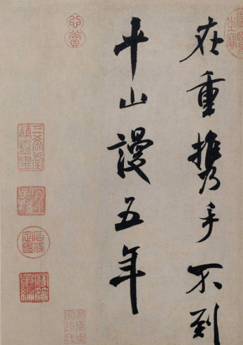 把一个个精彩的字串成一行,再组成一篇,这就是章法。《淡墨秋山诗帖》的气韵生动,一大半功劳要归于它行气贯通,浑然一体。米芾是怎么做到的呢?主要靠“牵丝引带”。字和字之间,他不是完全分开的,经常用非常细、非常自然的游丝把笔意连起来。这种连接,有的是实连(笔画连着),更多的是虚连(笔断意连),就是上一个字的结束笔势,自然地带出下一个字的起笔。您顺着字序看下来,感觉笔尖在纸上跳着一支连贯的舞蹈,气息绵延不绝。