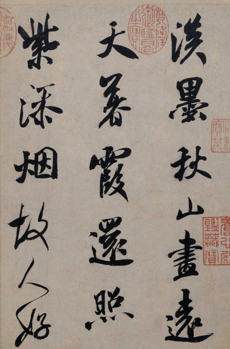 这篇帖子叫《淡墨秋山诗帖》,点名了用的是“淡墨”。这可不仅仅是把墨磨淡点那么简单。用淡墨写字,难度其实更高。为啥?因为墨淡了,水分控制不好,笔画就容易洇成一团,显得没精神,也就是常说的“墨猪”。但您看米芾这篇,虽然墨色淡雅,可笔画依旧清晰、有力,线条的骨感一点没丢。这说明他对水墨的调和、对书写速度的控制已经达到了出神入化的地步。