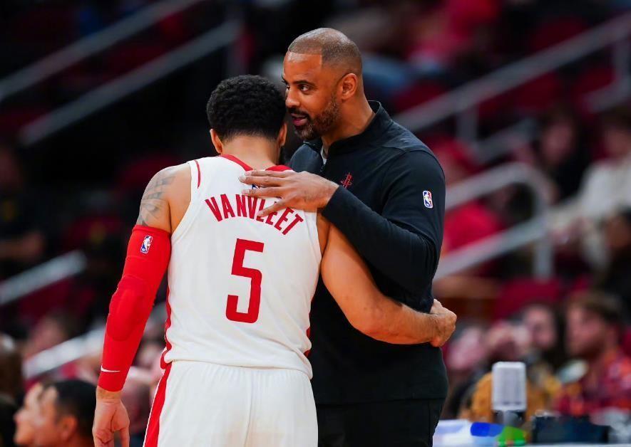 我们知道在赛季之前,火箭队组织的巴哈马小型训练营当中,火箭队老将范弗里特非常意外也非常不幸地遭遇了前十字韧带撕裂的重伤,之后他马上接受了手术,进而宣布赛季报销。但范弗里特也没闲着,除了在球场上指导火箭年轻球员们训练之外,还经常出现在火箭队的比赛场边,亲自为谢泼德、阿门汤普森两位年轻的控球后卫讲解战术和要求。