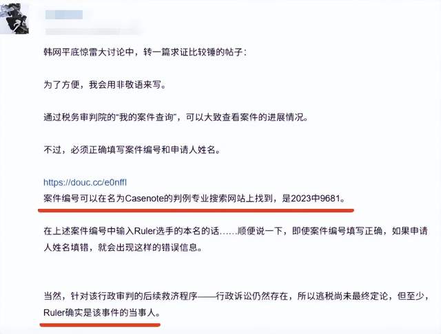 事情的起因是有网友在韩的判决案件公示系统中,发现了一份与某知名电竞选手相关的文件。判决书中提到,当事人涉嫌逃税,且在2018年至2021年期间多次参加海外电竞比赛,其父亲未能陪同。这些细节与Ruler的经历高度吻合——2017年首次海外比赛在中国,父亲当时还在公司上班;2018年S赛在韩举办,没有出境记录;2019年所属战队未进S赛;2020年后因疫情限制家属无法陪同。这一连串的时间线,几乎就是照着Ruler的履历写的。