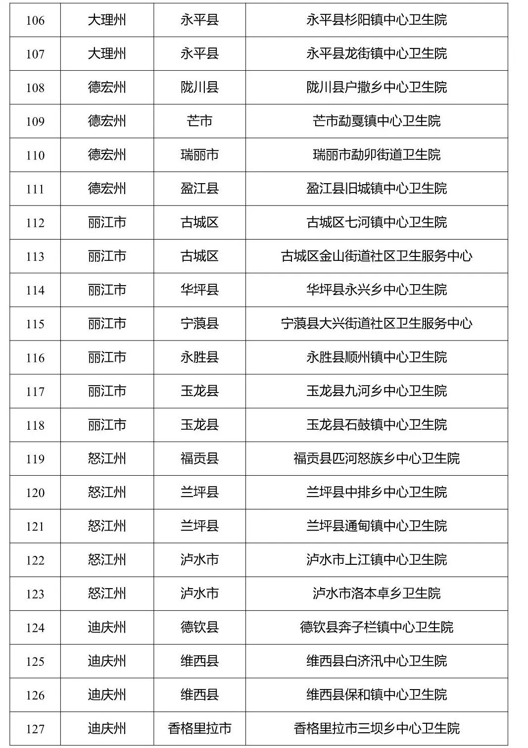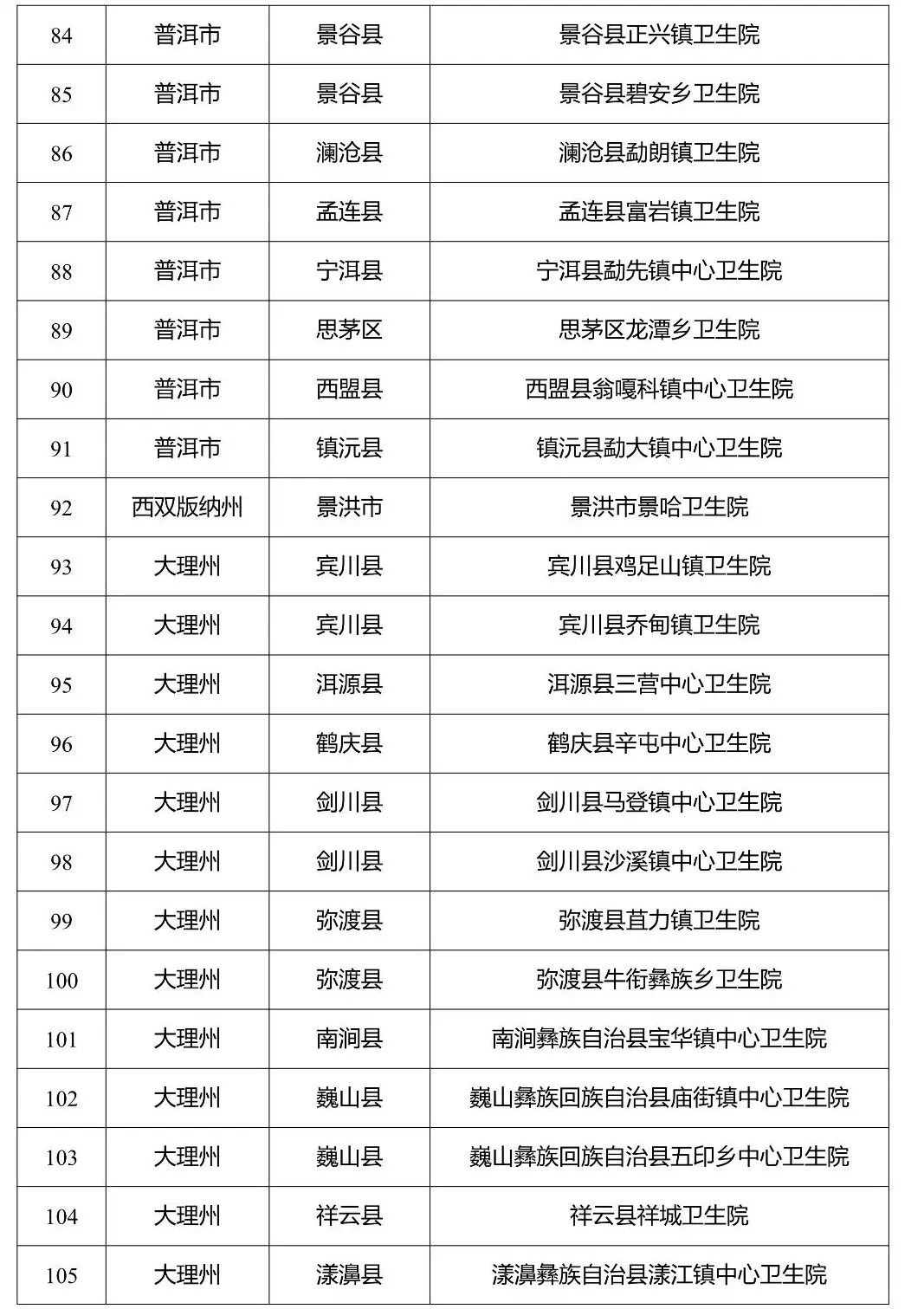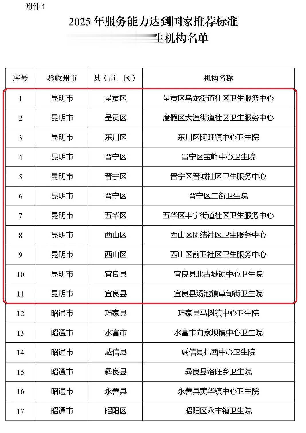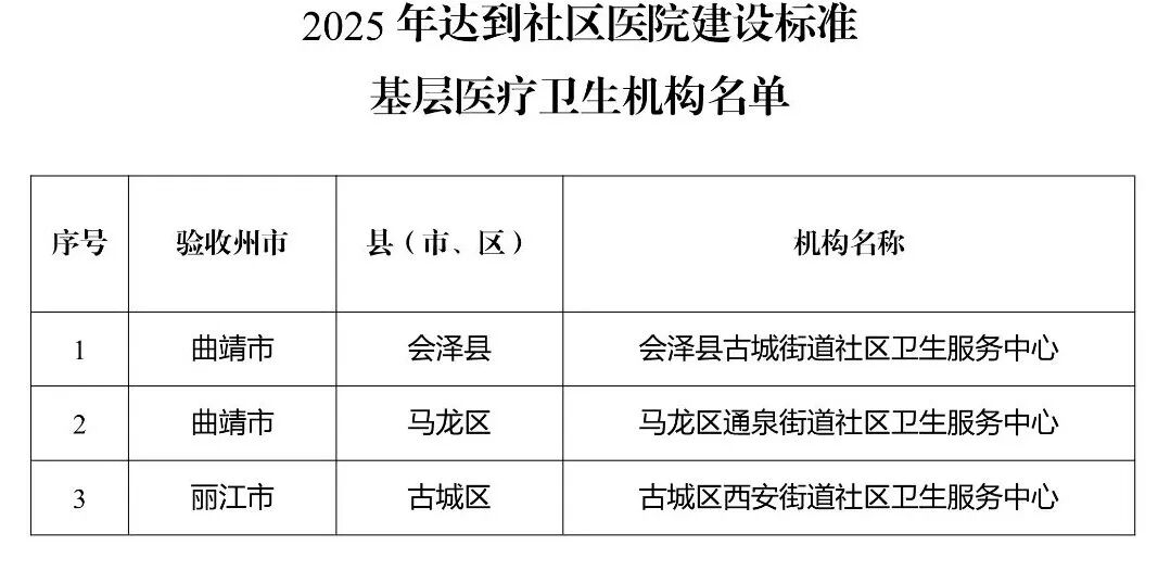 根据国家卫生健康委办公厅、国家中医药管理局综合司、国家疾病预防控制局综合司《关于实施“优质服务基层行”活动和社区医院建设三年行动的通知》,云南省卫生健康委办公室、云南省疾控局综合处《关于转发实施“优质服务基层行”活动和社区医院建设三年行动文件的通知》要求,云南省卫生健康委组织专家,对经州(市)复核达到国家推荐标准的基层医疗卫生机构进行省级现场复核验收,昆明市呈贡区乌龙街道社区卫生服务中心等132家乡镇卫生院(社区卫生服务中心)达到国家推荐标准,3家社区卫生服务中心达到社区医院建设标准,现予以公示。