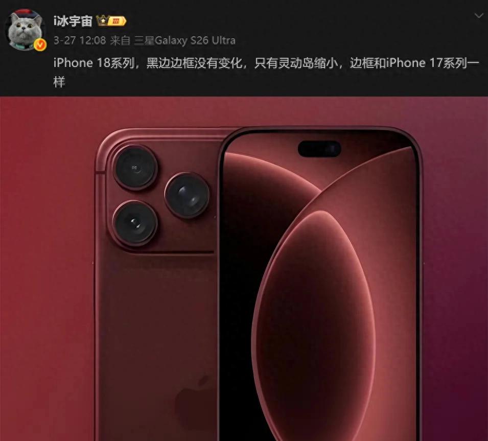 按照惯例,苹果将于今年秋季发布新款iPhone 18 Pro系列。近期关于该系列新机的争议点,主要围绕在其灵动岛的调整与否。有消息源认为,iPhone 18 Pro系列依然采用与前代相同的灵动岛设计;但也有不少声音称,苹果将为其配备重新设计的“缩小版灵动岛”。近日,博主@@i冰宇宙发布消息再次表示,iPhone 18 Pro系列将缩小灵动岛,但其屏幕黑边边框则与前代无异。