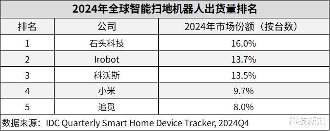 IDC数据显示,2024年,追觅全在全球扫地机器人的市场份额约为8%,排名第五。排在前面的四家企业中,有三家是中国企业。分别为:石头科技(约16%)、科沃斯(13.5%)、小米(9.7%)。