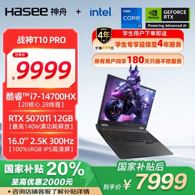 无考虑均衡体验就是神舟战神 T10 Proi7-14700HX处理器 加持140W 满血版RTX5070Ti显卡。16英寸300Hz电竞屏响应延迟仅4.3毫秒。原价9699元,国补后7999元到手,比竞品便宜近2000元,性价比堪称绝杀。