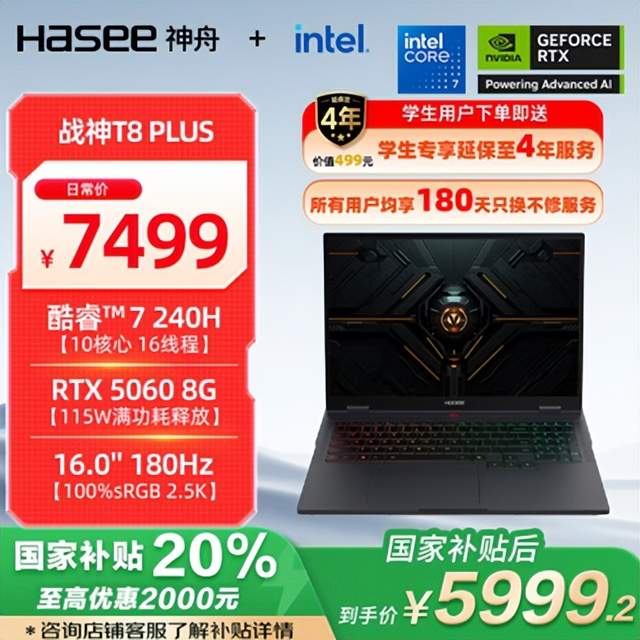 注重性价比选择神舟战神 T8 Plus 堪称完美选择。英特尔酷睿i7240H处理器,10核心16线程适配多样使用场景;NVIDIA RTX 5060 显卡115W满功耗释放,在优秀散热加持下,轻松驾驭绝大部分3A大作与网游高画质需求。