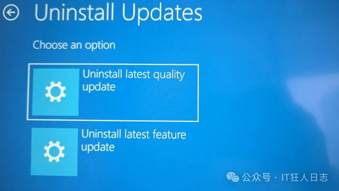 然后选择卸载更新,英文版本为:uninstall updates,接下来就看到:Uninstall latest qualityupdate 和Uninstall latest featureupdate,分别代表最近的质量更新和功能更新,依次点击这两个选项,目的是卸载最近的更新
