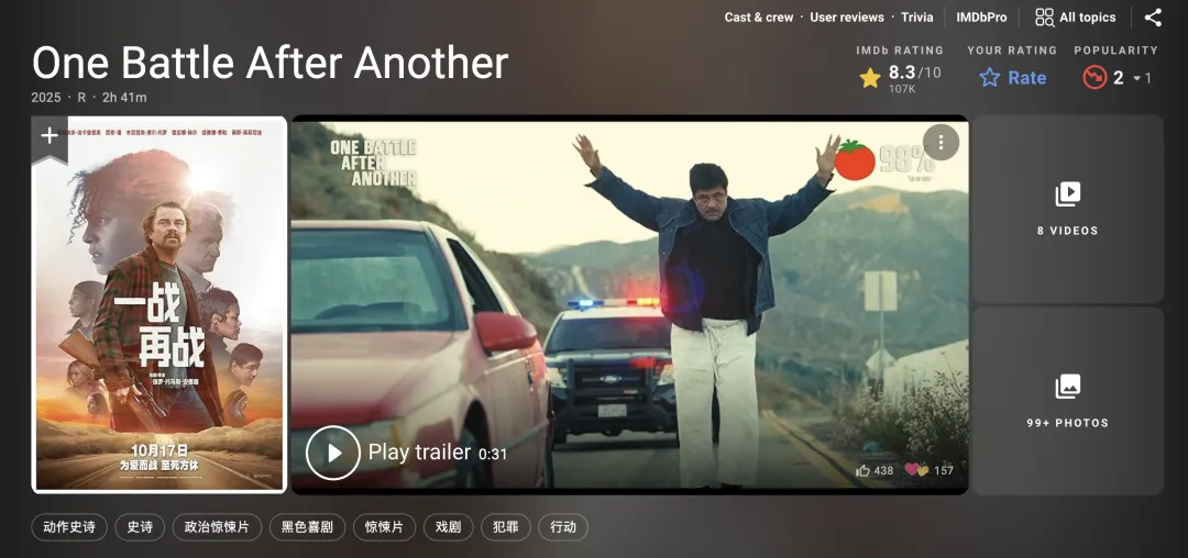类型片外衣:动作与悬疑交织的叙事架构《一战再战》以成熟的类型片语法为框架,将高强度的动作场面与悬疑叙事紧密结合,既符合主流市场对视觉奇观的期待,又将主角鲍勃的成长困境巧妙嵌入剧情,使得严肃的主题在沉浸式叙事中自然落地。