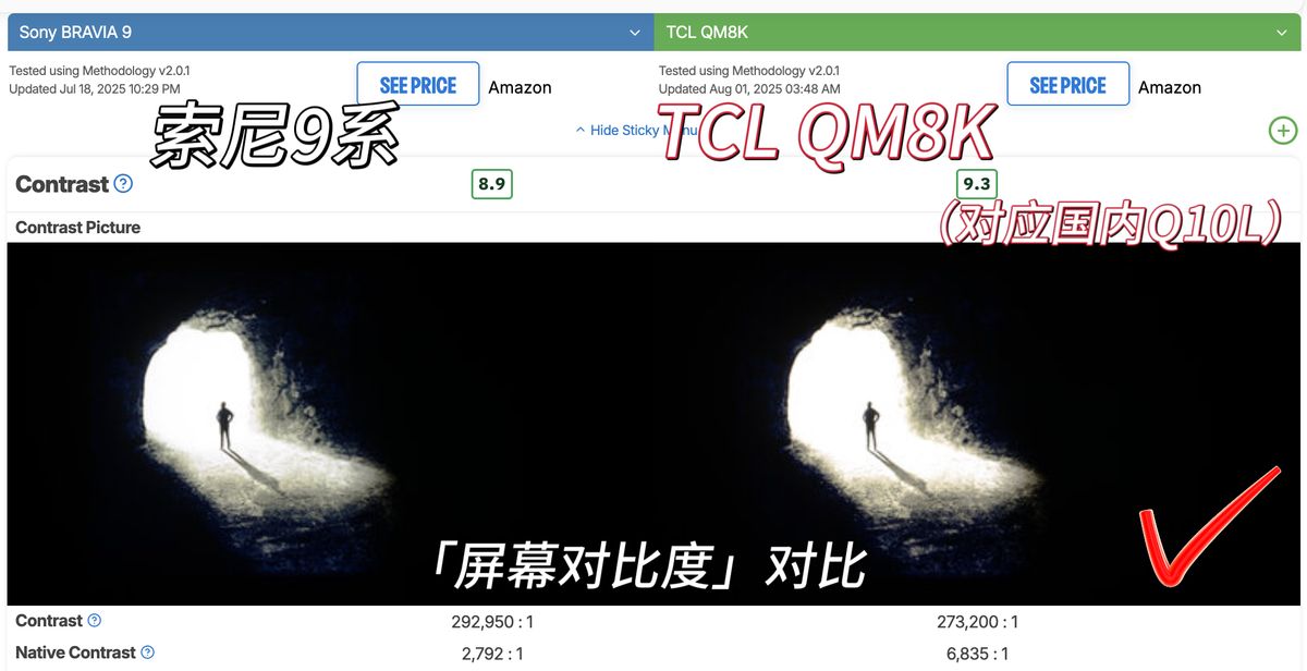 TCL QM8K对比度评分高达9.3,优于索尼9系的8.9分,TCL QM8K评分高得益于其搭载的高对比度屏,原生对比度实测接近7000:1