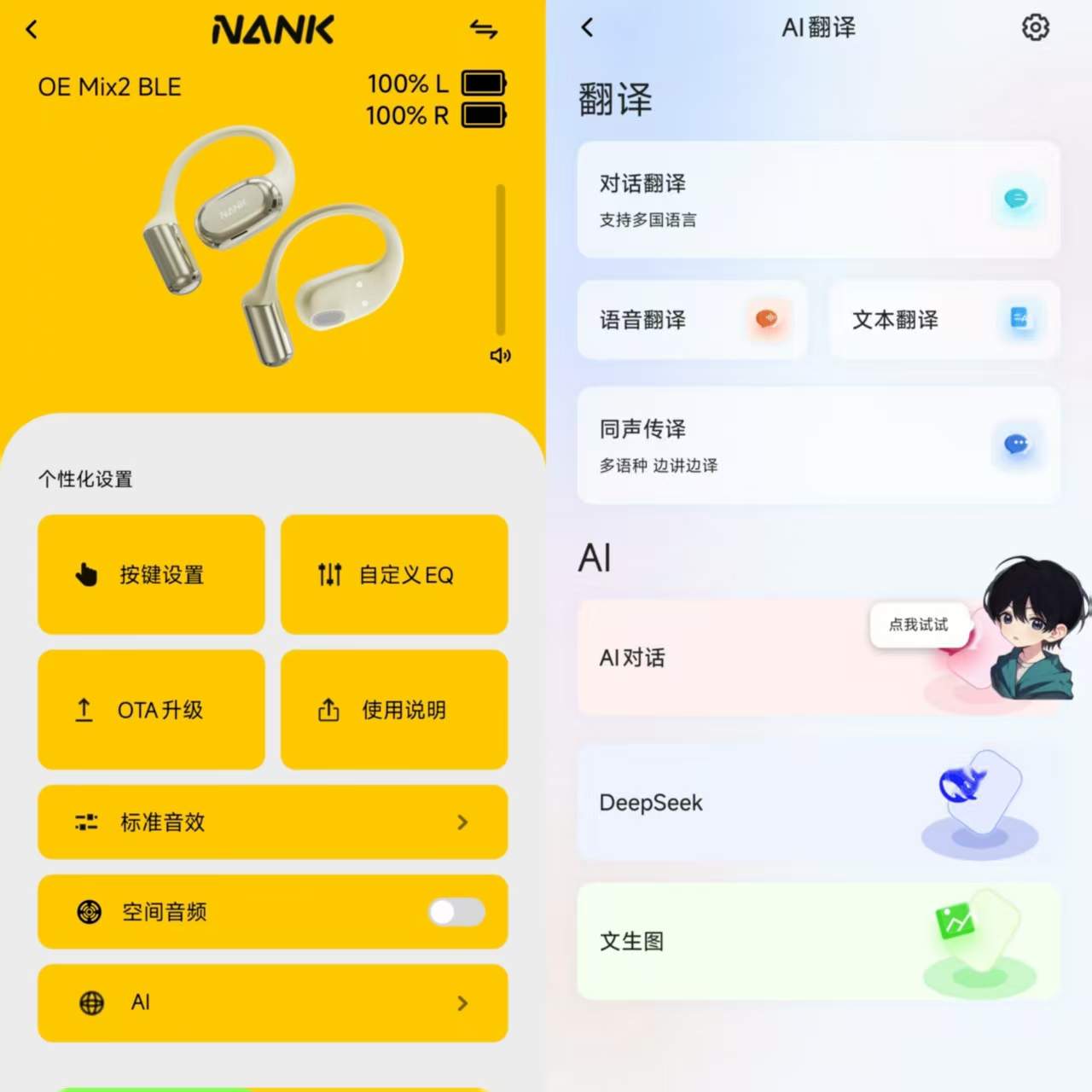 当大部分开放式耳机还停留在 “听” 的基础功能时,南卡 OE Mix2 已经进化到了 “会思考” 的阶段。它集成了讯飞、DeepSeek 等多模态南卡 AI 智能系统,宛如一位贴心的智能小助手时刻陪伴在身边。无论是日常的语音助手功能,还是更高级的 AI 对话、AI 翻译,甚至是 AI 生成图像和写作,它都能轻松胜任。在学习外语时,AI 翻译功能反应迅速且准确,实时的翻译让语言学习变得更加高效;与朋友分享旅途见闻时,AI 生成图像功能能根据我的描述瞬间生成生动有趣的画面,增添了不少乐趣。这种全方位的智能交互体验,让耳机不再仅仅是一个音频设备,更是生活和学习中的得力伙伴。