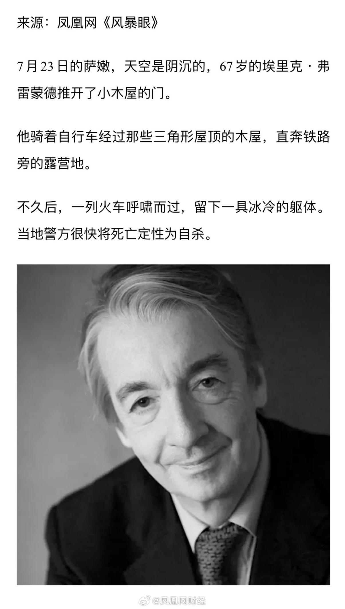 但在问询结束不到两周的时间里,67岁的弗雷蒙德在瑞士阿尔卑斯山区的度假木屋附近,骑自行车时被一列火车撞上,当场身亡。瑞士警方判定其为自杀。