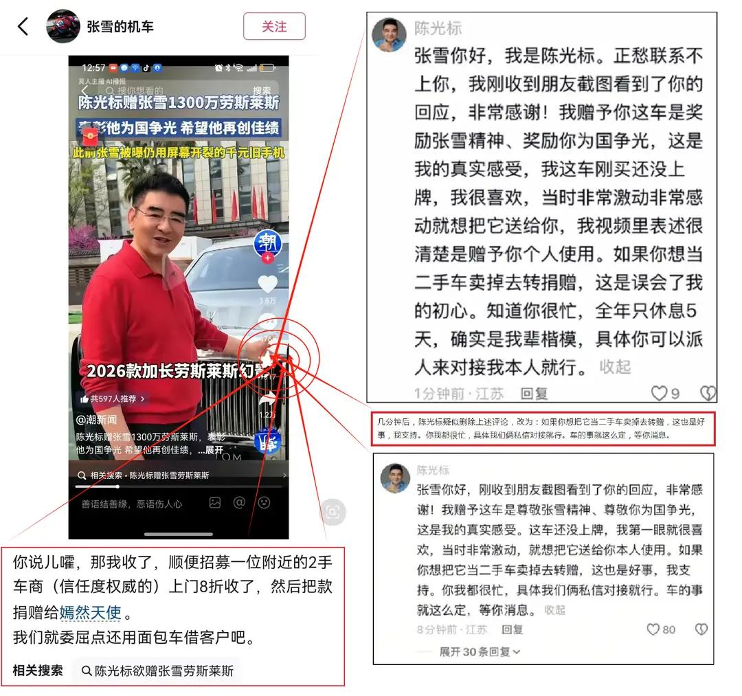 1300万赠车,张雪接了,说要卖车捐嫣然。陈光标先是留言“误会了我的初心”,然后秒删,改口“你想卖就卖,我支持”。自己先“误会”,后“支持”——这叫什么?这叫被舆论推着走。
