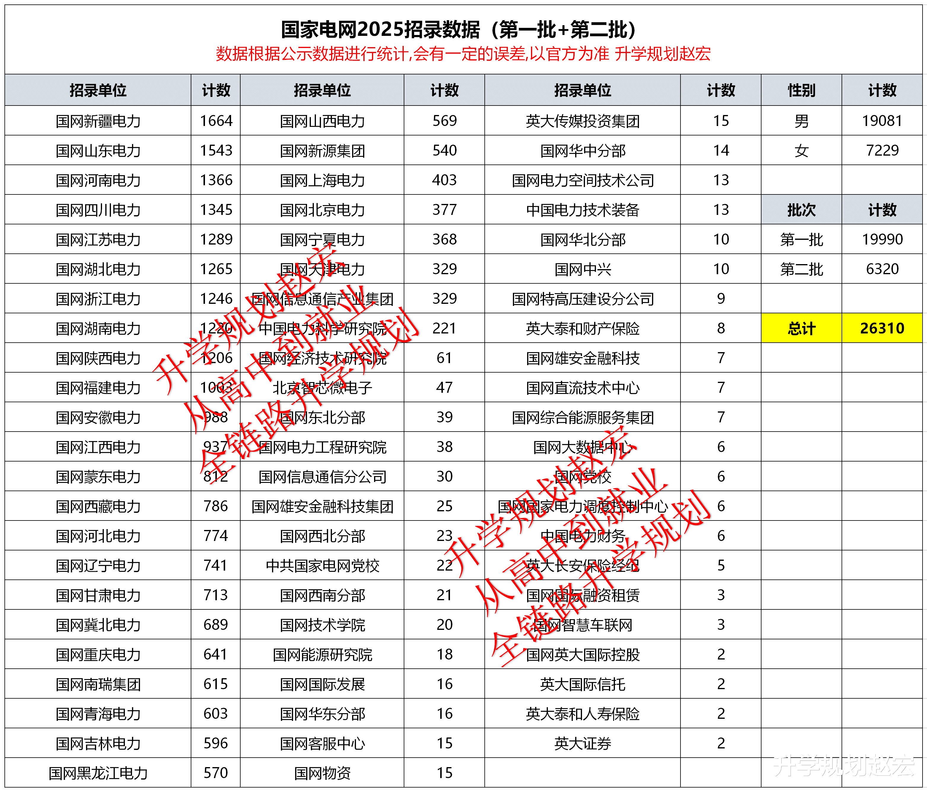 这段时间一直很忙,其实我们数据早就有了,没来及去整理。国家电网2025年的各个批次都有,包括第三批的,由于第三批人数不多,也不少主流,所以本文咱们来看看国家电网2025年第一批和第二批的录取情况。总共26310人,加上第三批预计有27000人左右,另外数据是软件加工处理的,会有一些误差。但是并不影响整体趋势的判断,我们要的也不是具体的数字,看的是整体的大变化。更多的是为低年级的做选择提供参考。