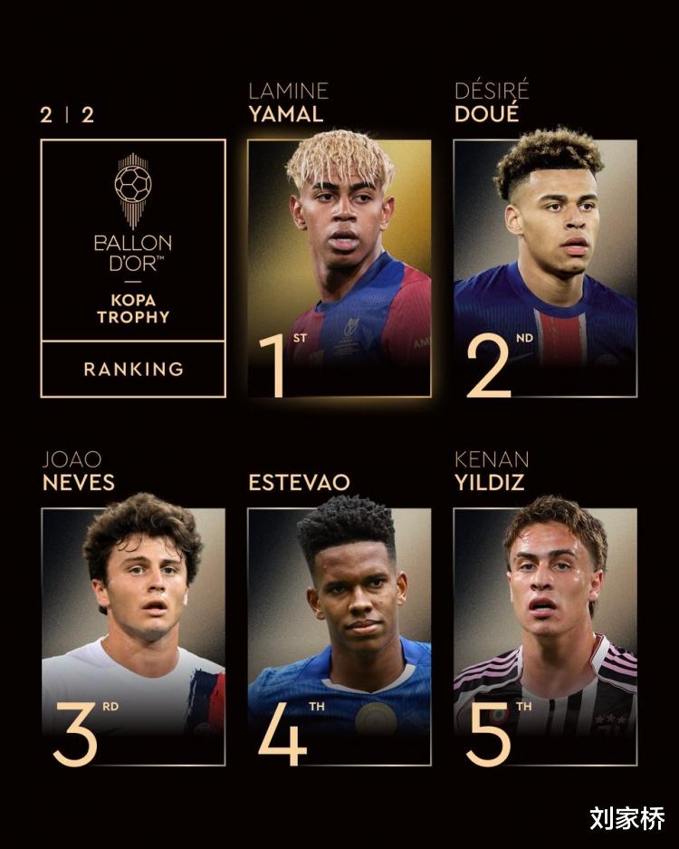 今晨,金球奖官方公布“科帕奖”最终排名,18岁的巴萨天才亚马尔当之无愧斩获第一,而尤文10号伊尔迪兹也得到评委信任,排在亚马尔、杜埃、内维斯和埃斯特万之后,荣获第五殊荣。