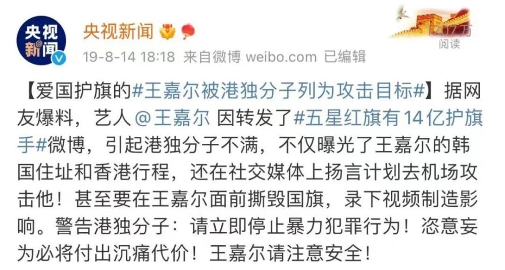 这引起“港独”分子的不满,一些极端者不仅曝光了王嘉尔的韩国住址和香港行程,甚至还在社交媒体上扬言计划去机场攻击他。