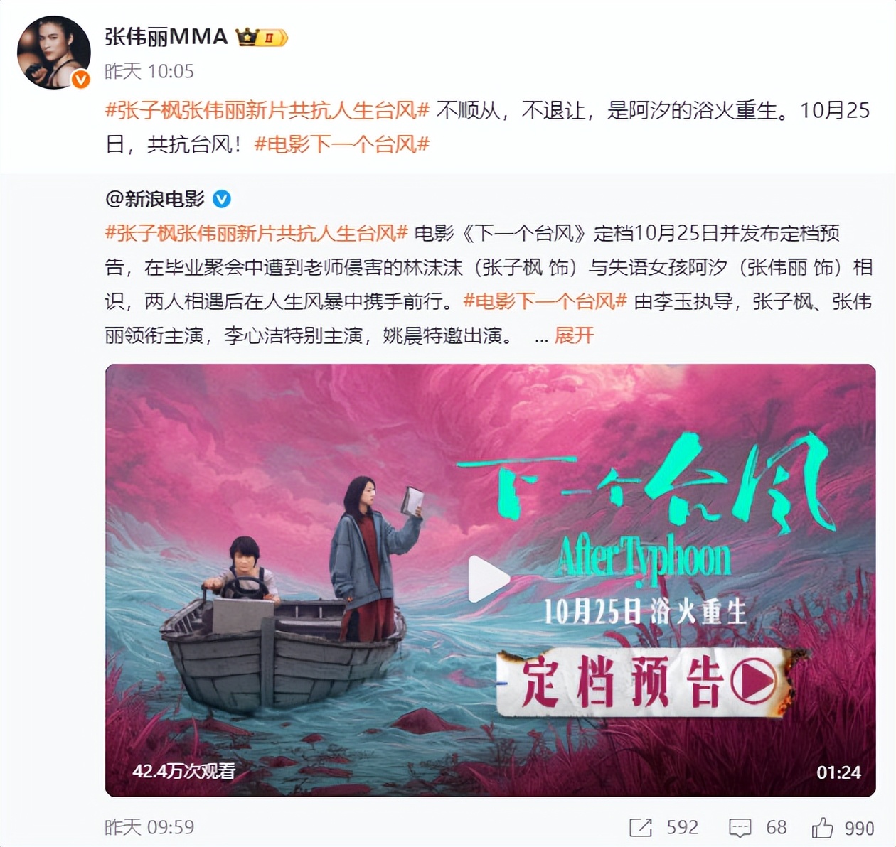 随着电影《下一个台风》正式官宣定档,张伟丽也发文诠释角色本身:不顺从,不退让,是阿汐的浴火重生。10月25日,共抗台风!这次出演《下一站台风》,是张伟丽从格斗赛场转向荧屏演绎的首次尝试,她在影片中的表现也备受外界期待。