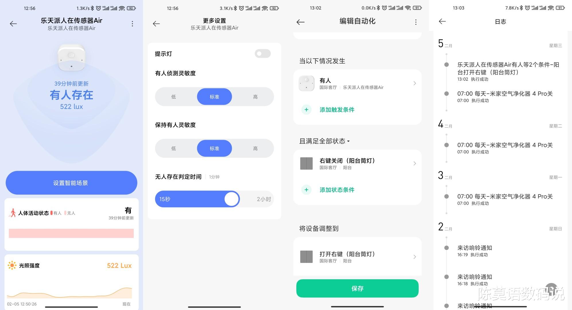 协议方面,乐天派人在传感器Air是一款米家系智能家居设备,支持小米澎湃智联。使用米家APP可以查看实时光照强度、有人无人状态记录等,还可以进行侦测灵敏度和无人存在判定时间设置,这些对于我们实际安装调试很有帮助。自动化联动设置时,可以根据个人需求,进行个性定制。依靠人在传感器来实现的人来灯亮人走灯灭的效果,肯定要比小夜灯要强多了。