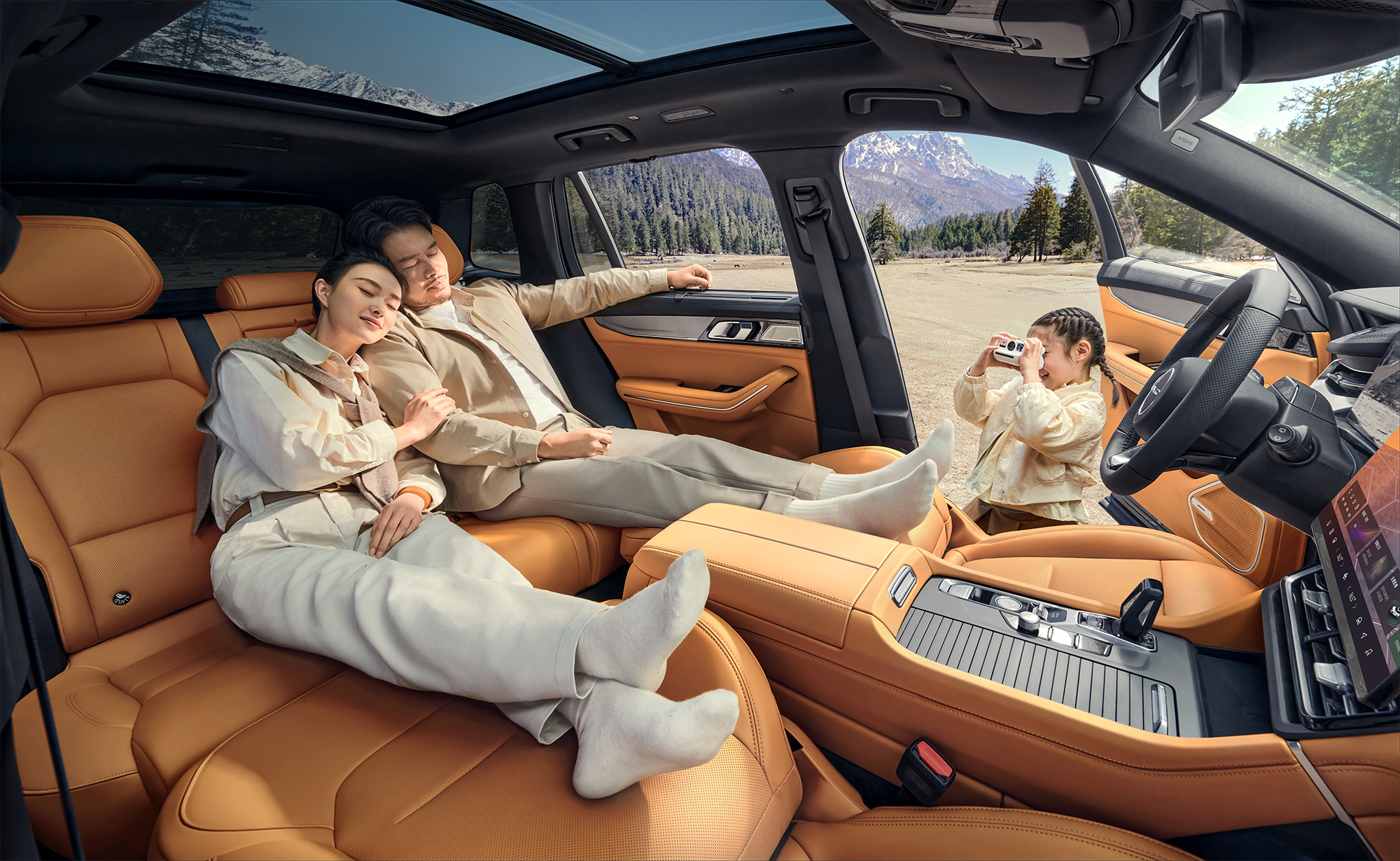 人们向往探享世界的美好和自由,也追求旅途中每一刻的宽适与舒适。领克09 EM-P四驱Max大五座空间升级,拥有同级最宽二排空间,座椅横向宽度为1366mm,坐垫深度540mm,为同级最大,腿部最大空间1130mm,3人乘坐轻松自在,长途久坐也不疲累。二排座椅立起后,后备箱空间达691L,足以装下全家出行所需的行李和露营装备。而当二排座椅放倒,后备箱空间扩容至1522L,为同级最大,铺上床垫秒变2米“大床”,在没有天花板的户外小憩,从容更惬意。