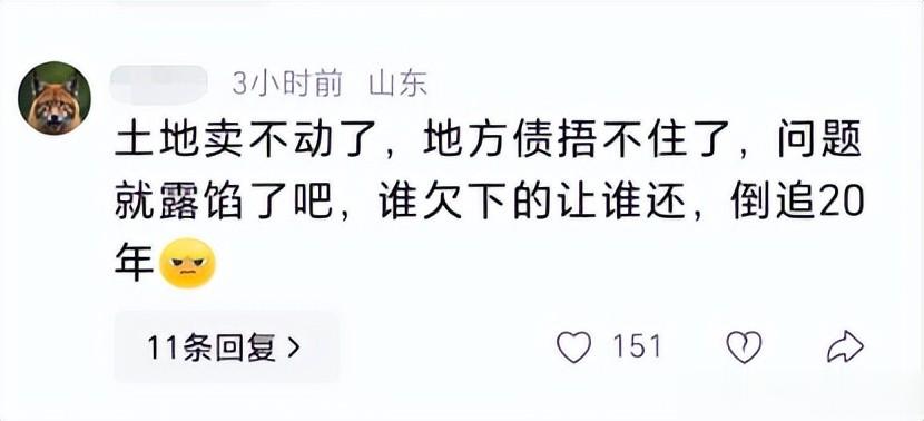 我看到有位网友是这么评论的:土地卖不动了,地方债捂不住了,问题就露馅了吧,谁欠下的让谁还,倒追20年。