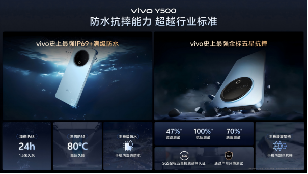 在防水能力上,vivo Y500实现了里程碑式的跨越,拥有vivo史上最强IP68/69/69+满级防水,不仅通过1.5米的水深中持续浸泡24个小时测试,还能够通过6分钟喷水口压强相当于100倍大气压的80℃高温喷水测试。
