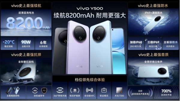 2025年9月1日,vivo Y500正式发布,该机搭载vivo史上最强8200mAh超薄蓝海电池,支持IP68/69/69+满级防水能力,配合金刚磐石架构,耐用实力全面提升,堪称中端机中的“续航耐用双灭霸”。vivo Y500同时拥有旗舰级外观设计、360°穿墙天线,以及全景