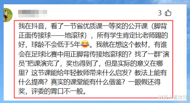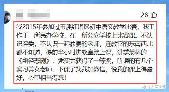 这场在无数校园里上演的《楚门的世界》,早已是教育界心照不宣的“传统”。在网友留言中,不乏清流般的存在——有人分享2015年参加教学比赛的傲人经历:“谁也不认识,提前半小时进教室,讲季羡林的《幽径悲剧》,愣是凭实力拿了一等奖!”字里行间满是对真实教学的自信。