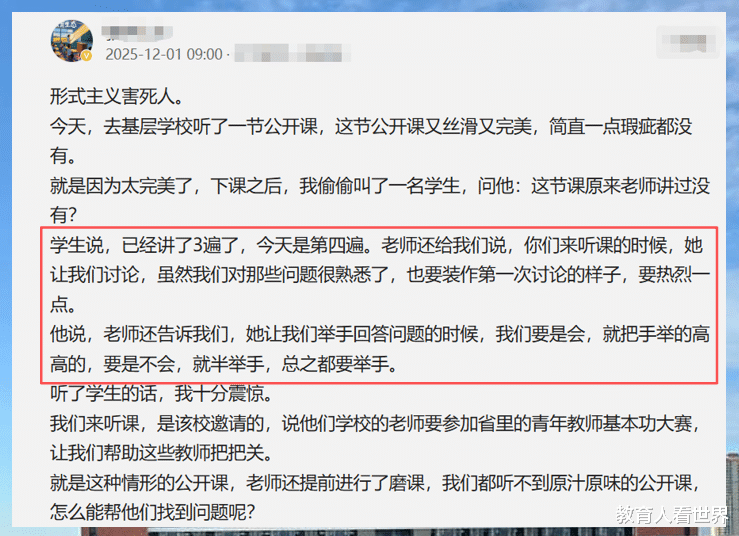 他去某校听一节公开课,本意是为参赛教师“把关”,却意外闯入了一个排练娴熟的“剧场”。他描述自己坐在教室后排,看着台上老师挥洒自如,台下学生对答如流,每个环节都像精心设计的舞台剧,过渡完美得令人起疑——真实的课堂,哪有这么丝滑?