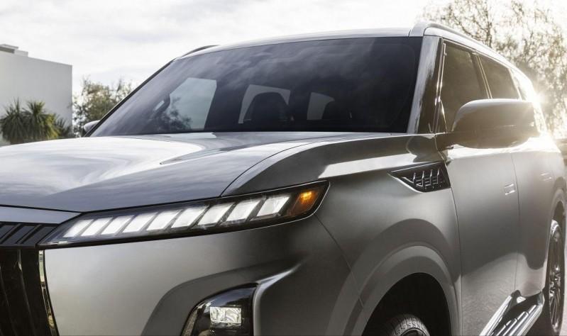 外观方面,全新一代美规版英菲尼迪QX80延续了较早前亮相的QX Monograph概念车造型设计,前脸采用大量的几何造型,配备全新样式的双弓形家族式进气格栅,造型修长的分离式LED头灯灯组,整体看起来很霸气。与此同时,前保险杠还增加了贯穿式进气口设计,并且两侧还配备直立式灯组,点亮之后辨识度很高。