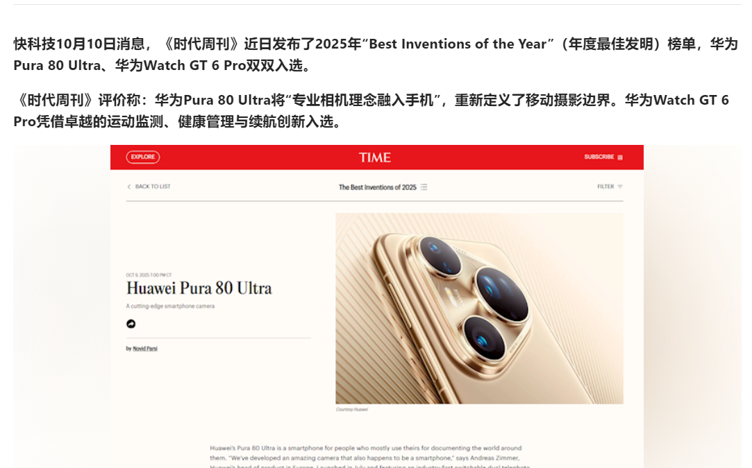 经过多年的迭代积累,华为终端的智能产品已展现出在办公场景下的强大技术实力。以此次展会上的HUAWEI MatePad Mini为例,8.8英寸的超小尺寸展现出极强的办公性能,与华为手机、华为MateBook等产品轻松实现跨设备互联、无缝协同。借助“超级中转站”功能,用户仅需拖拽文件即可实现跨设备的传输,省去了U盘、文件传输助手等繁琐操作。尤其是HUAWEI Pura 80 Ultra更凭借将“专业相机理念融入手机”,重新定义移动摄影边界的突破性表现,入选《时代周刊》2025年度最佳发明榜单。HUAWEI WATCH GT 6 Pro也因在运动监测、健康管理与续航方面的卓越创新,同样入选此次《时代周刊》年度最佳发明榜单,彰显出华为在智能穿戴领域的领先实力。