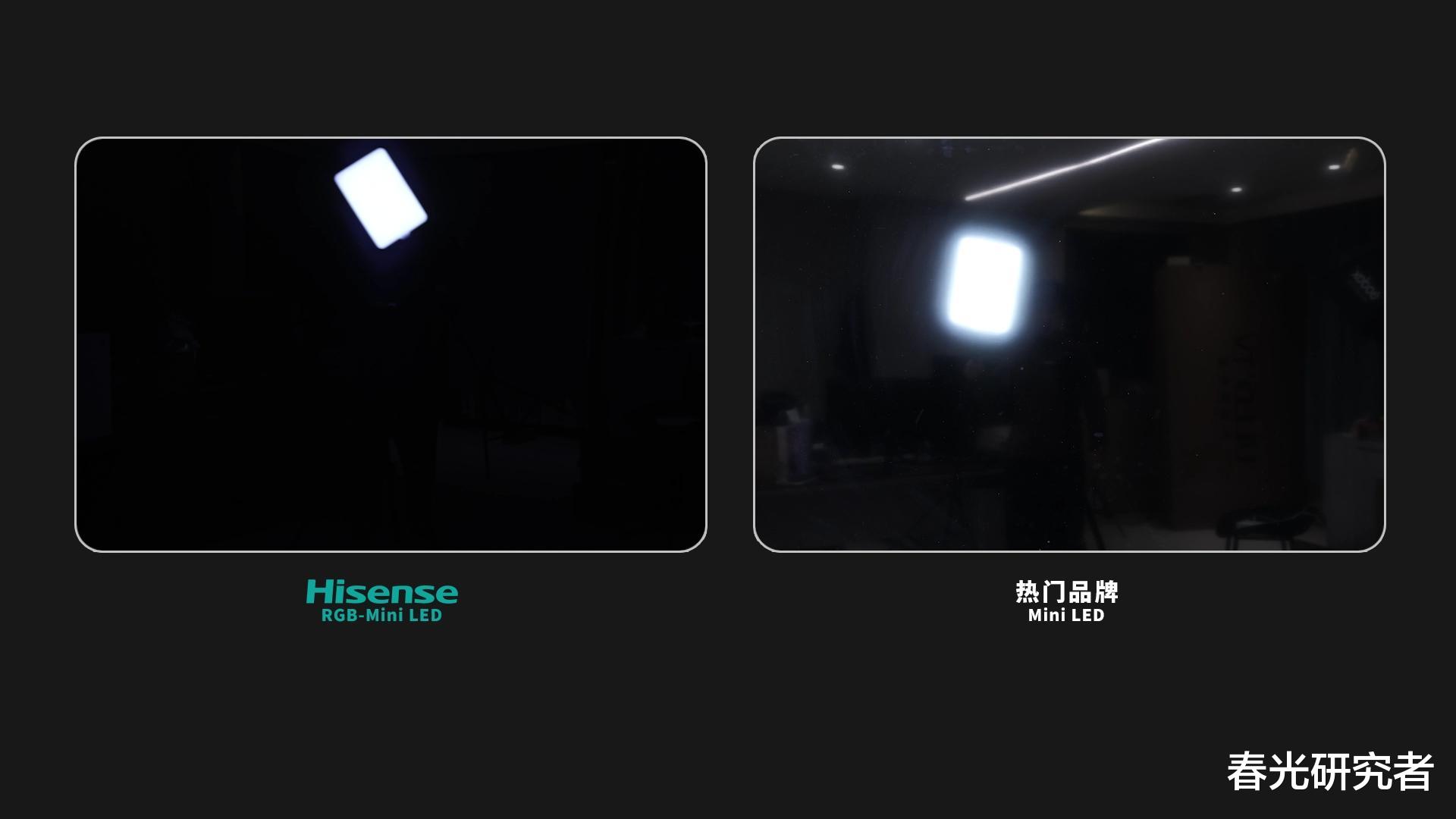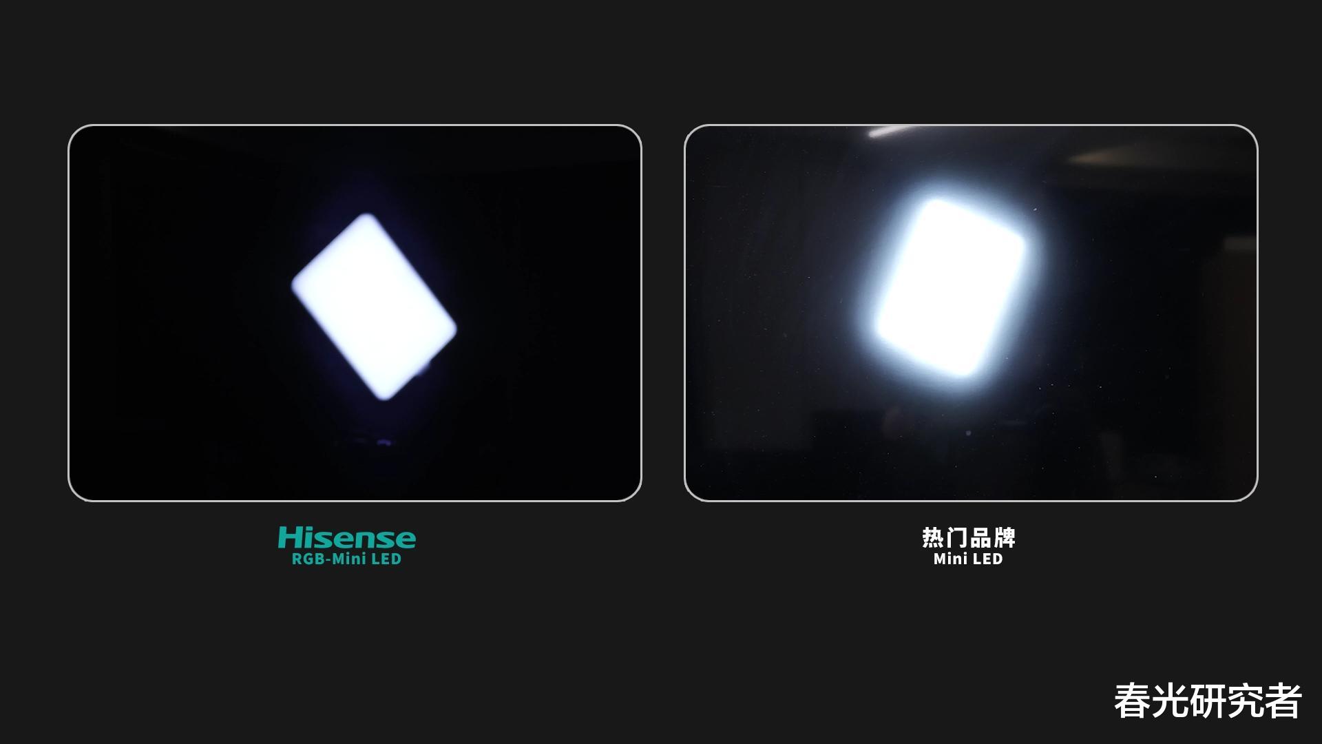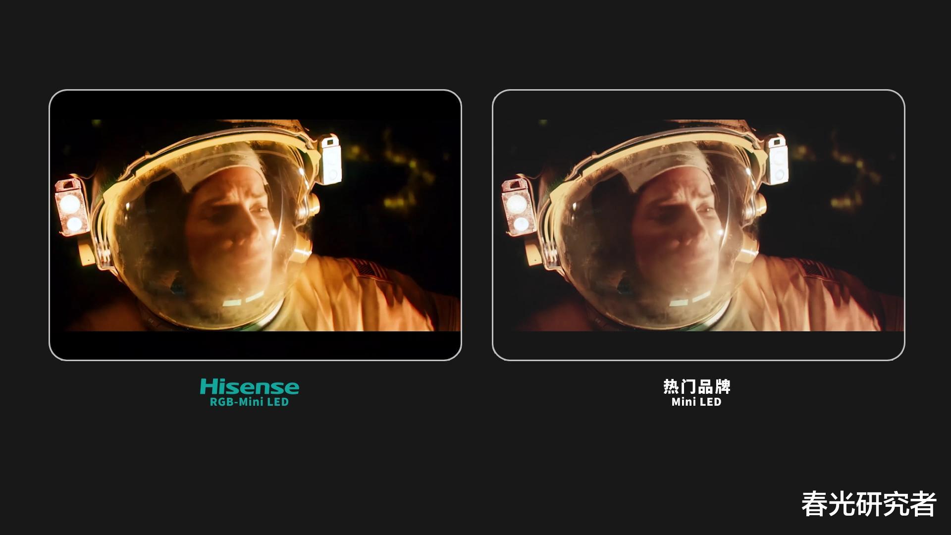 亮度&光晕那在亮度方面,两款电视同样存在差异,因为Mini LED的背光需要穿过膜片,会存在损耗。但是RGB-Mini LED就不需要,光衰减更少。比如大量的暗场环境,海信E8S Pro呈现的细节会更多更明亮。