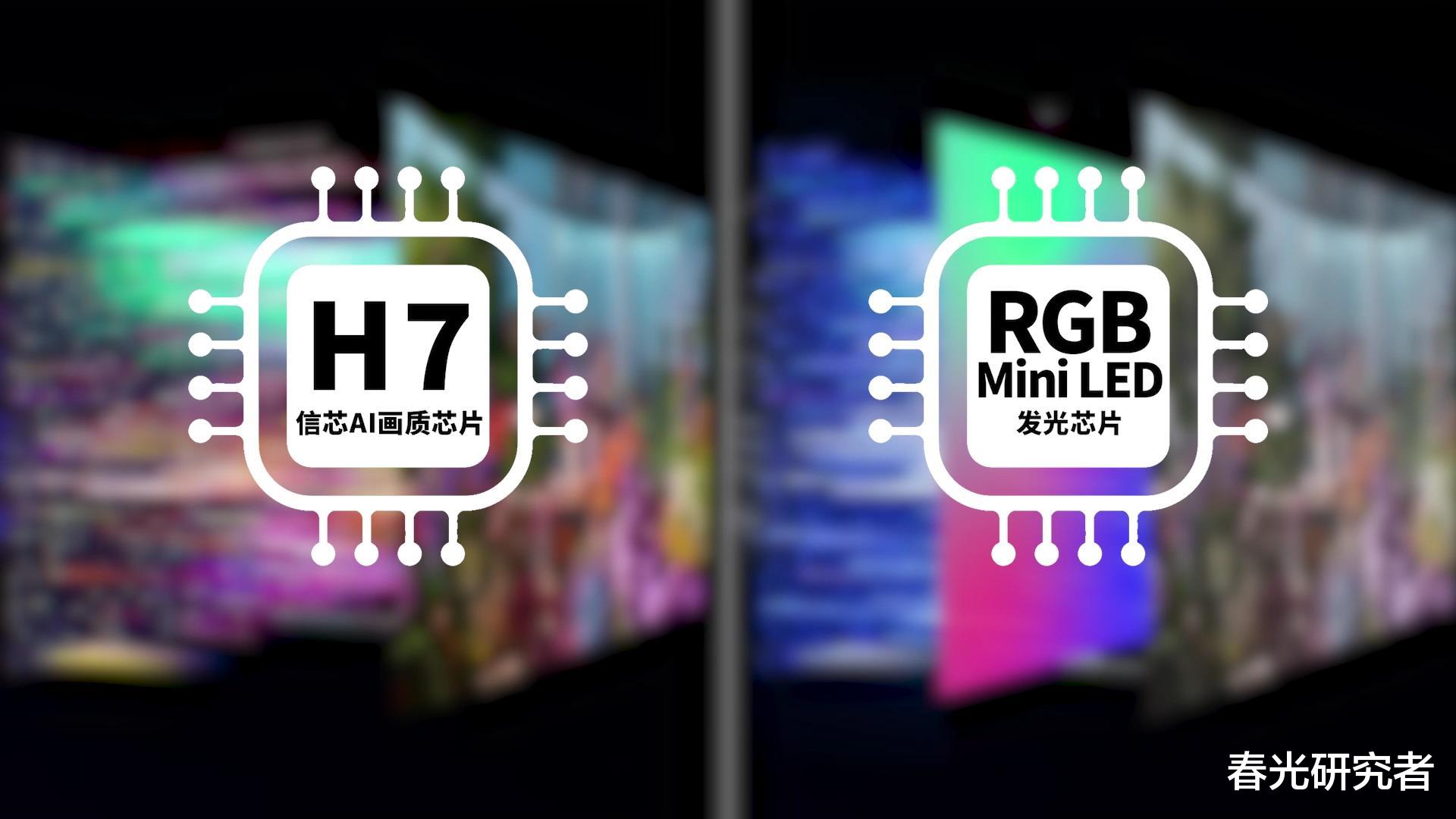 当然了,RGB-Mini LED的实现难度也更高。因为把单色背光拆分成了三色,所以不仅要控光,还要控色。再加上要考虑到不同灯珠的效率、平衡、寿命,这些对于算法的要求都非常高,所以海信给这台E8S Pro配备了两枚芯片,信芯AI画质芯片H7和RGB-Mini LED发光芯片。硬件只是地基,双芯的调校才是核心。