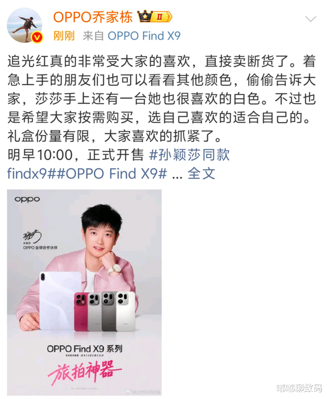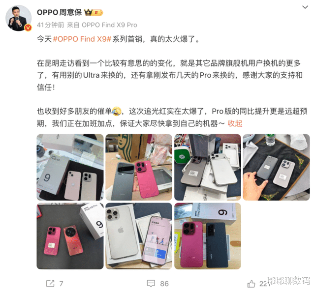 今天好多人在讨论,OPPO Find X9系列首销开售,场面十分火爆,甚至部分版本被抢到售罄!OPPO产品经理表示:好多朋友催单,已经在加班加点生产了。而在换机的用户,更是有不少用其他品牌的Pro、Ultra机型来换的。可见OPPO这款旅拍神器吸引力有多大!