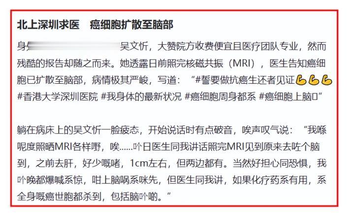 癌症入脑,意味着病情已经进入最凶险的阶段,为了省钱、为了活下去,她特意来到内地治疗。
