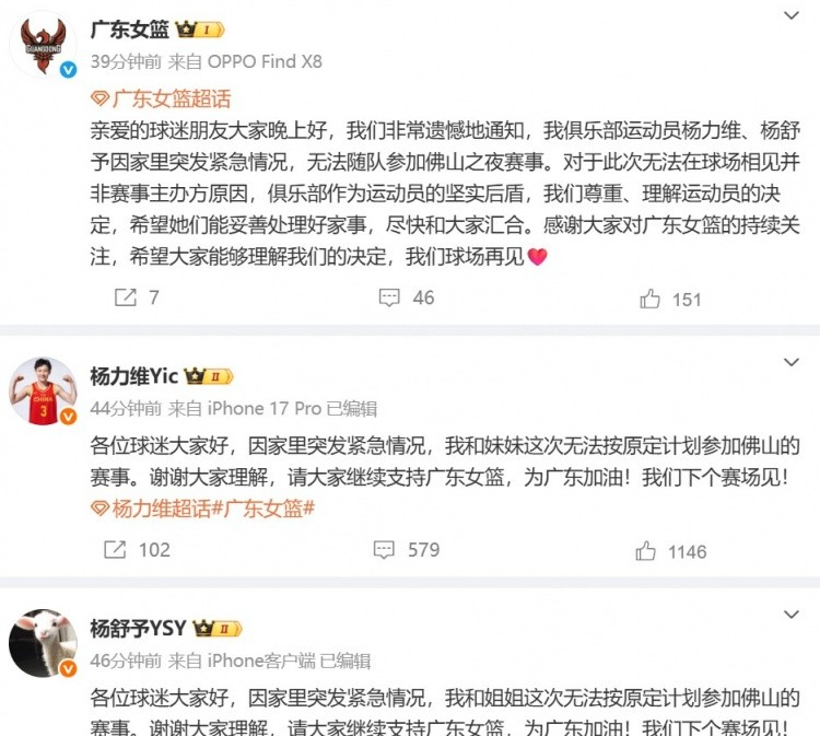 接下来是杨力维和杨舒予的消息,14日晚广东全运女篮跟北京全运女篮有一场热身赛,但13日晚23:45分,杨力维和杨舒予以及广东女篮官方账号向后发文。她们二人因家里突发紧急情况,无法参加这场热身赛,这确实属于意外,不在所有人的计划中。至于她们家里发生什么事,我们也不做过多猜测,只希望所有人都平平安安,健健康康的。相信杨力维和杨舒予能够很好的处理好家里的突发情况,不要因此影响到自己的状态。