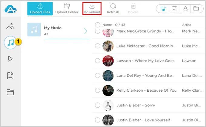 在网页界面中导航至“音乐”部分,选择您的文件,然后单击“下载”。