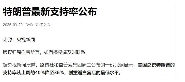 更雪上加霜的是,战争打响近一个月,坏消息接踵而至。据路透社3月24日消息,特朗普的支持率暴跌至36%,创下他就任总统以来的最低纪录。照此趋势发展,特朗普的中期选举必败无疑,整个共和党都将受其拖累。