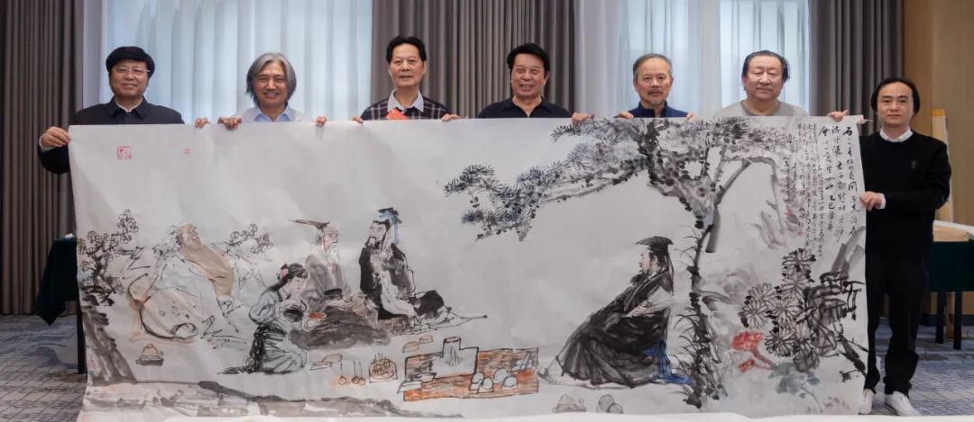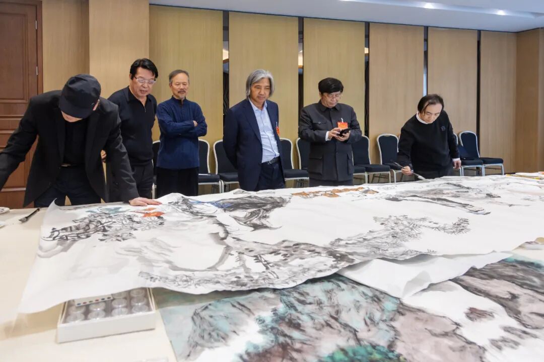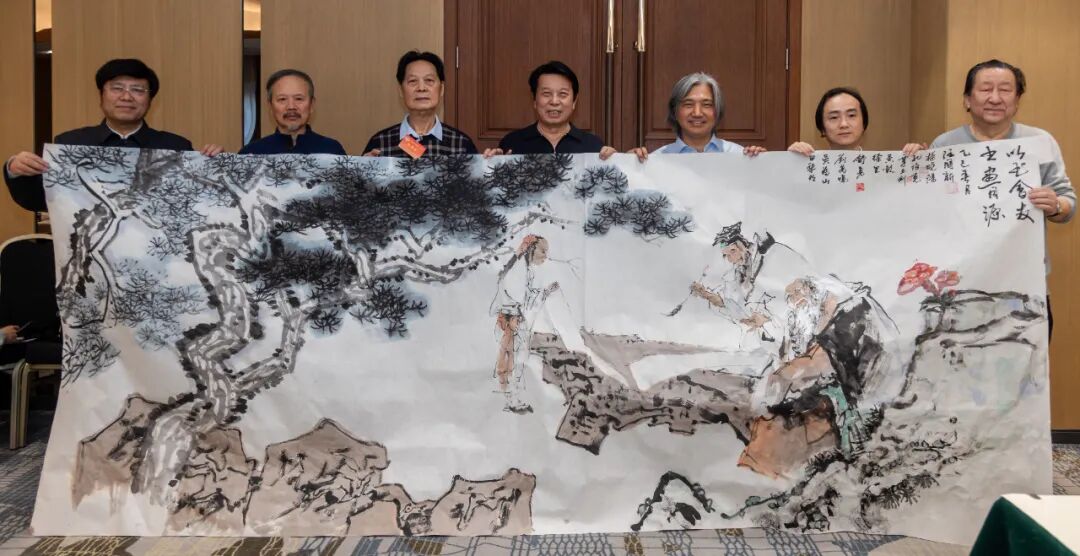 当天下午举行书画笔会交流。中国画人物、花鸟、山水三组以及书法两组共五组。冯远、吴为山、杨晓阳、徐里、刘万鸣、孔维克、田黎明、刘宇一、汪国新、覃志刚、舒勇等书画室成员,两个多小时间互相切磋,笔墨对话,合作了两幅丈二大画《石上青松明月间》及《以书会友图》。画家们配合默契,笔走龙蛇,画面开张,气韵灵动,磅礴大气。