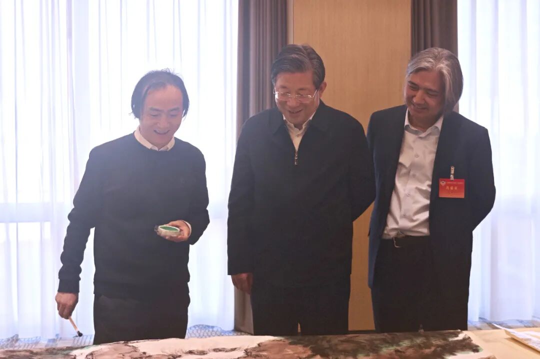 全国政协副主席兼秘书长、书画室主任王东峰(中)与全国政协副秘书长、书画室常务副主任吴为山(右)与舒勇