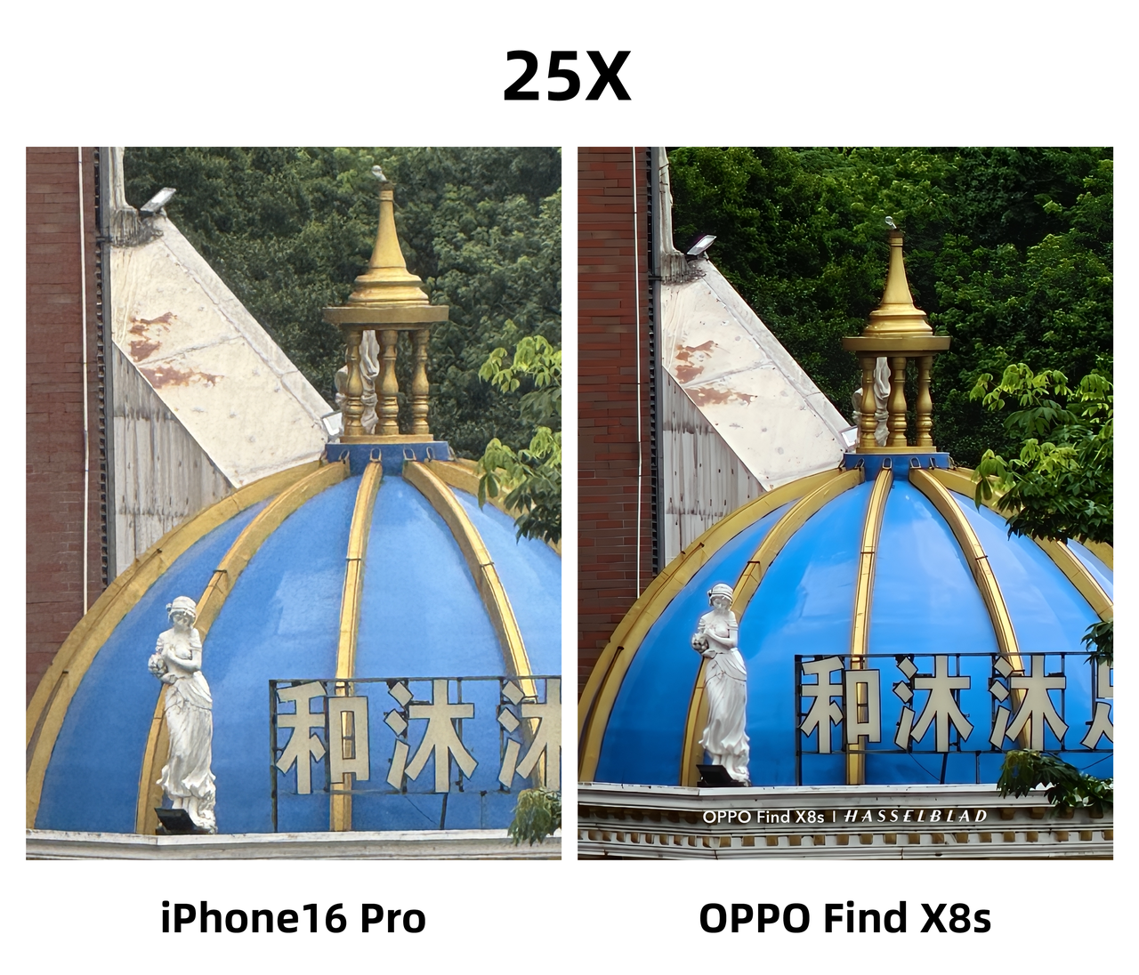 除此之外,Find X8s的长焦实力也是可圈可点,跟iPhone16比就是欺负它了,直接看跟iPhone16 Pro同台的照片吧!同样在25x镜头下,Find X8s的画面纯净度一眼看出区别,同时照片的细节还更多。