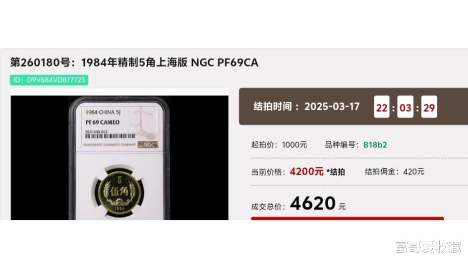 今天要分享的是,一枚1984年的“精制5角”(评级币),在NGC评级中,评级分数也是达到了“69分”,最后居然拍出了4620元。