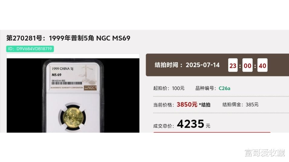 今天要分享的是,一枚1999年的“普制5角”(评级币),在NGC评级中,评级分数达到了“69分”,最后拍出了4235元。