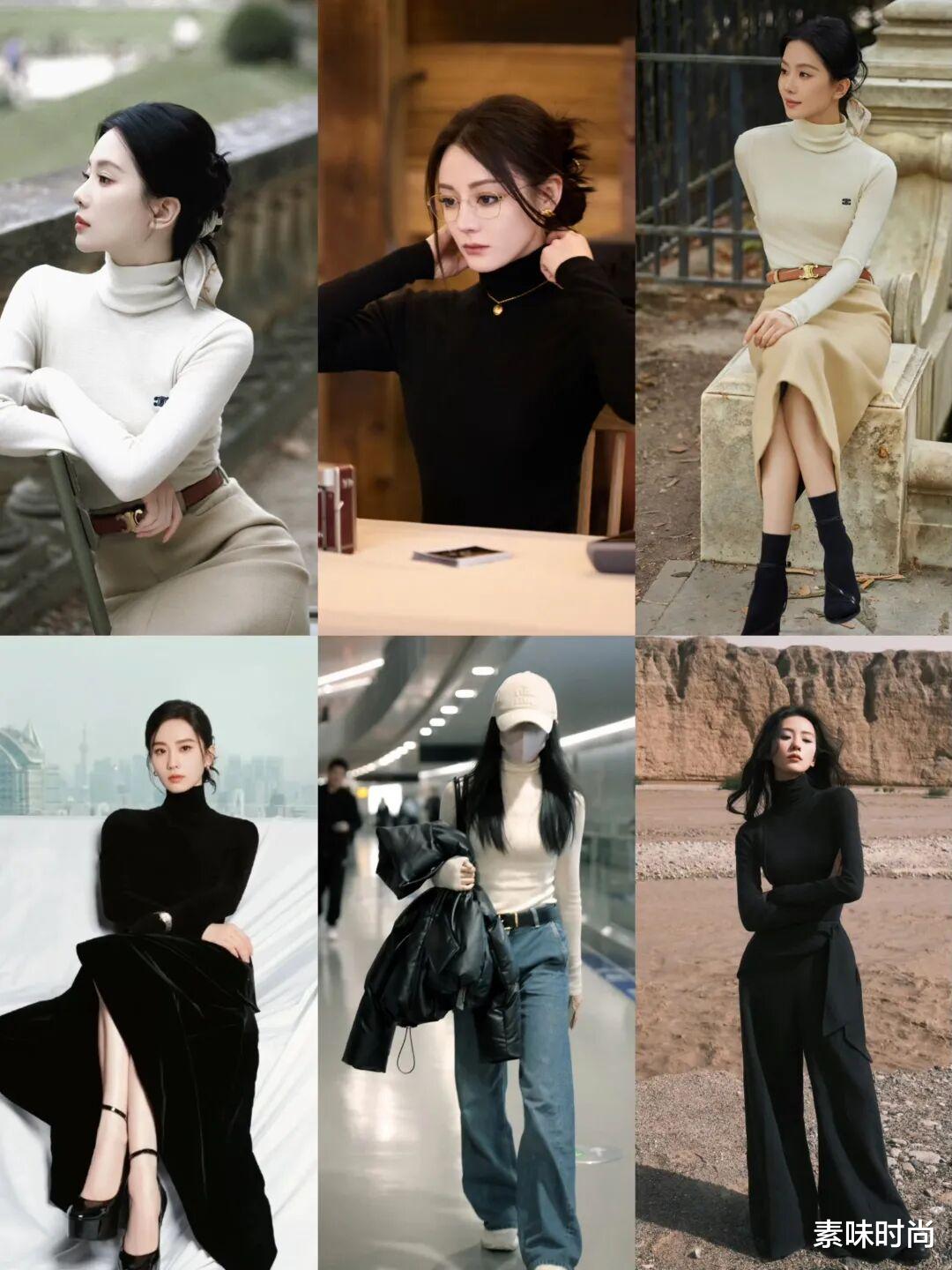 如果说你上半身比较纤细,脖颈线条这边比较好看的话,非常推荐大家可以去选择一款羊毛的,最好是无缝一体成型的那一种,合身偏修身的黑色高领打底衫.