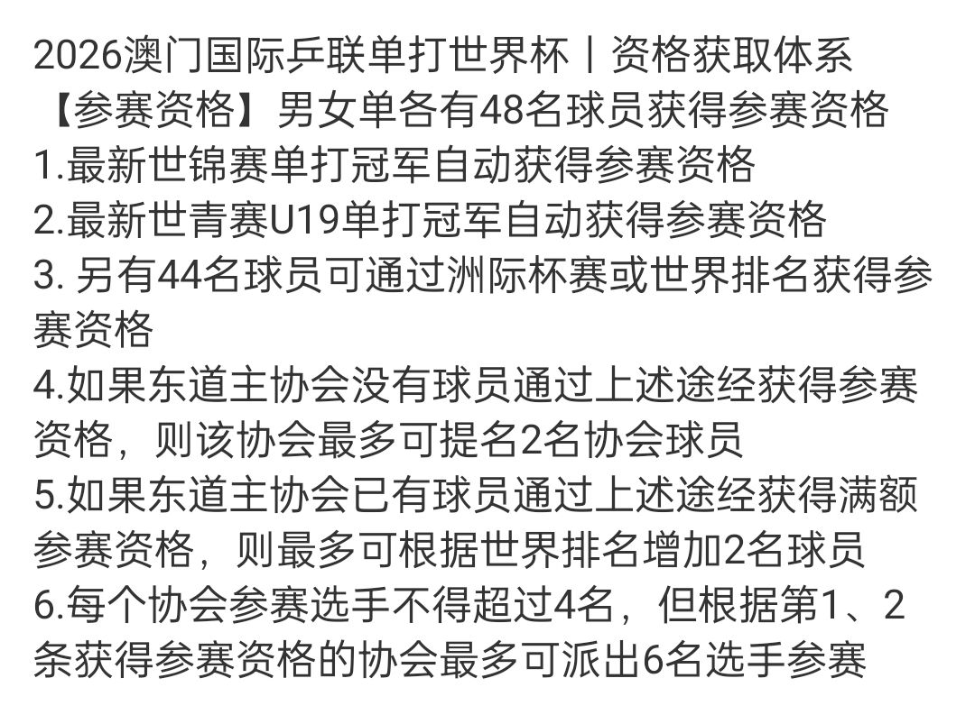 剩余名额如何分配引起讨论,规定世界杯单打各协会限四人(男女分开算),国际乒联介绍,另有44位球员可以通过洲际杯赛或者世界排名获得资格,但是如果存在世乒赛和世青赛冠军入围的情况,那么就能不占自己协会的名额,国乒还有男单和女单各4人,所以说主力队员基本都能参加。