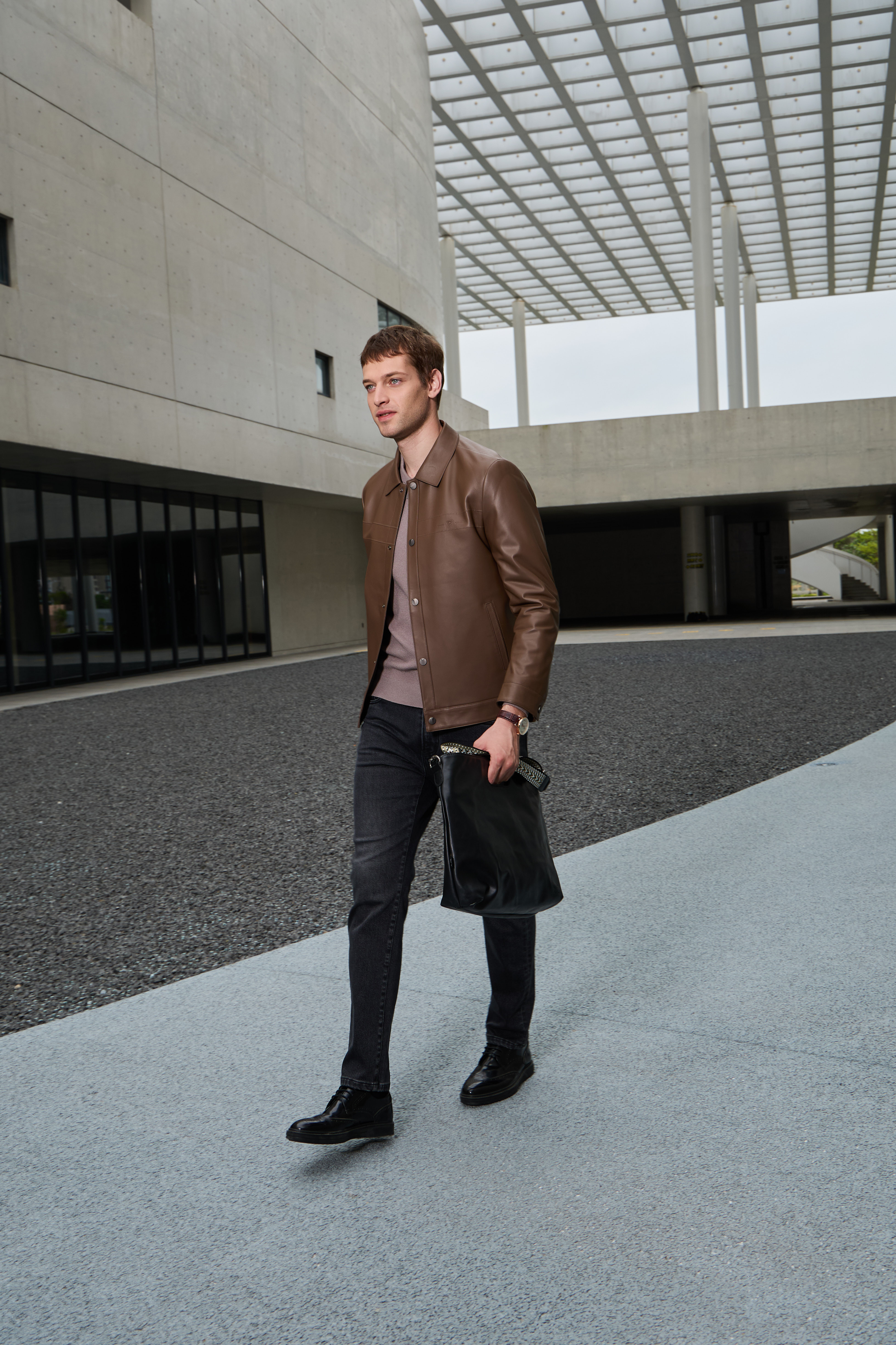 咖色皮衣内搭翻领毛衫形成层次过渡。材质上,短款皮茄克的硬挺廓形与高支毛衫的柔软垂坠形成刚柔对比,点缀轻奢质感。合身的皮茄克搭配牛仔裤的利落线条,实现职业气场