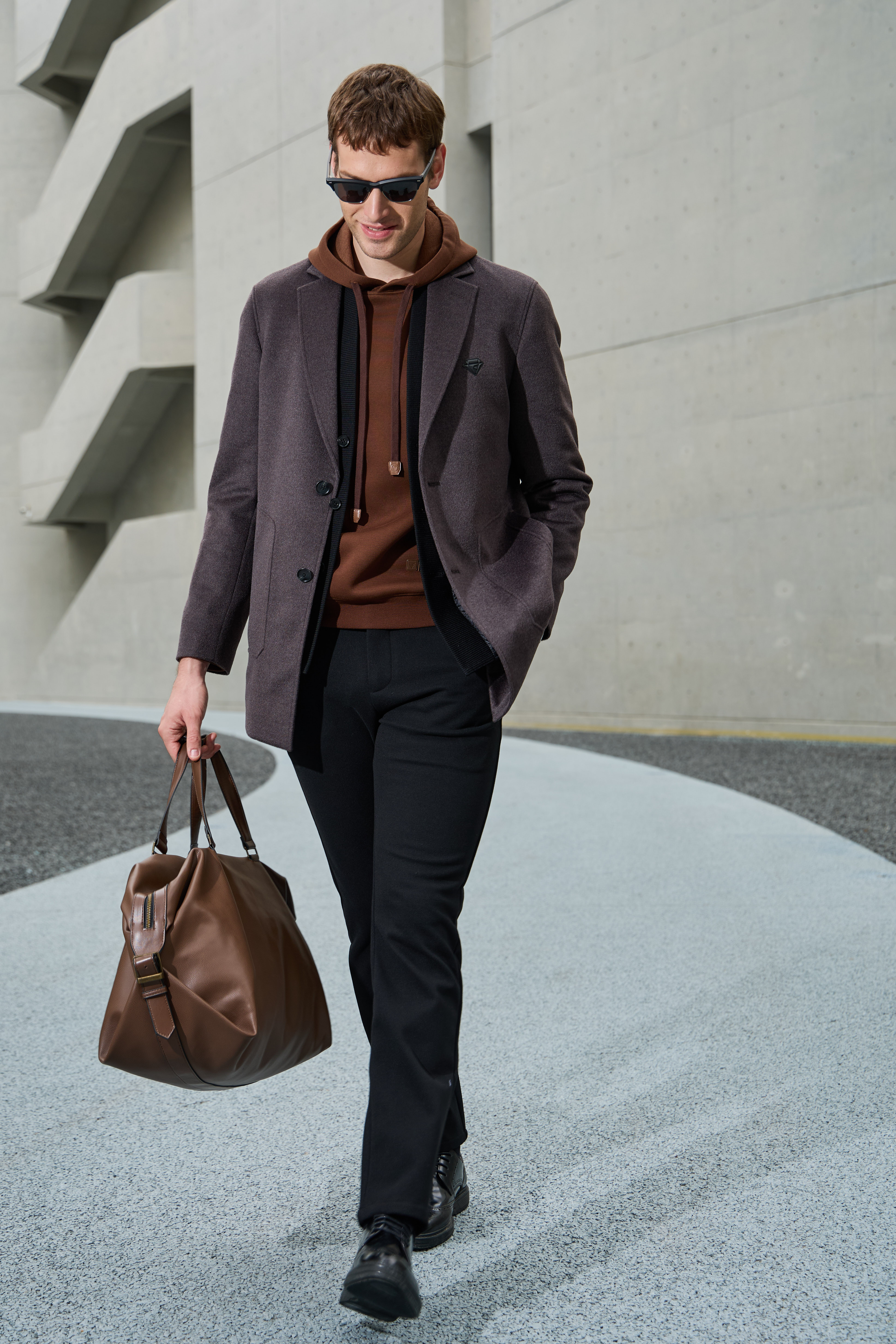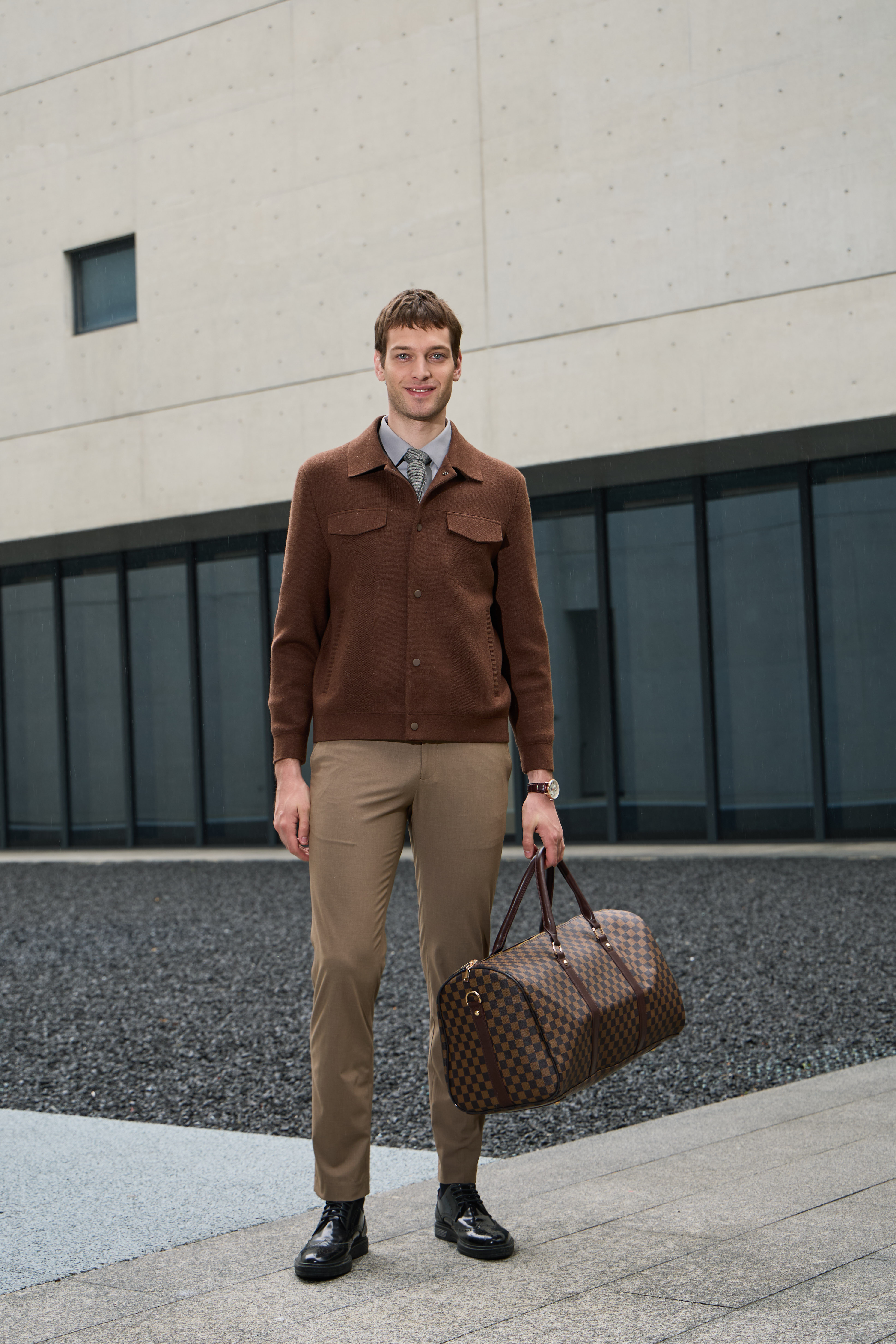 巧克力色提花毛呢茄克与同色系毛衫形成呼应,搭配卡其色休闲裤平衡沉稳与随性感,合身的剪裁与修身裤型勾勒利落线条,整体兼具商务场景的专业度与休闲场合的自在感,在低调中释放轻奢格调,适配多元场合的一衣多穿需求。