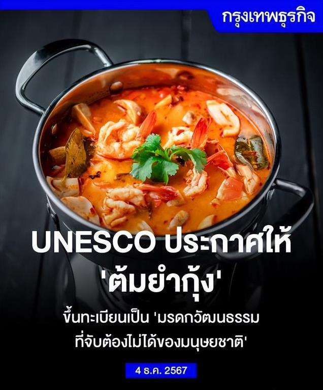 泰国时间12月4日凌晨02:15,联合国教科文组织保护非物质文化遗产政府间委员会第19次会议在巴拉圭亚松森举行,会议同意将泰国的“冬阴功(又称泰式酸辣虾汤)/Tomyum Kung”列入人类非物质文化遗产名录。