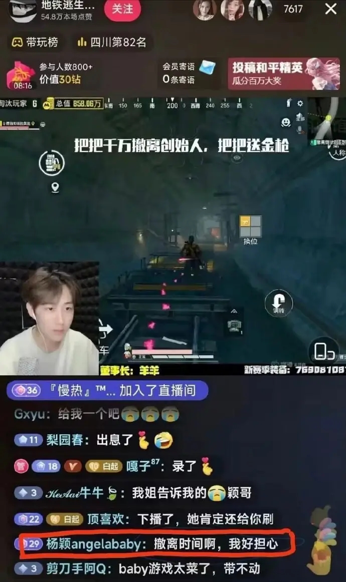 近日,有网友发现angelababy和黄晓明的儿子小海绵拿了妈妈的账号刷直播,在截图中,可以看到angelababy的账号一直在该直播的贡献用户榜单上,并且还在弹幕中留言“撤离时间啊,我好担心”,随后被网友喊话:“小海绵别玩你妈手机了”。