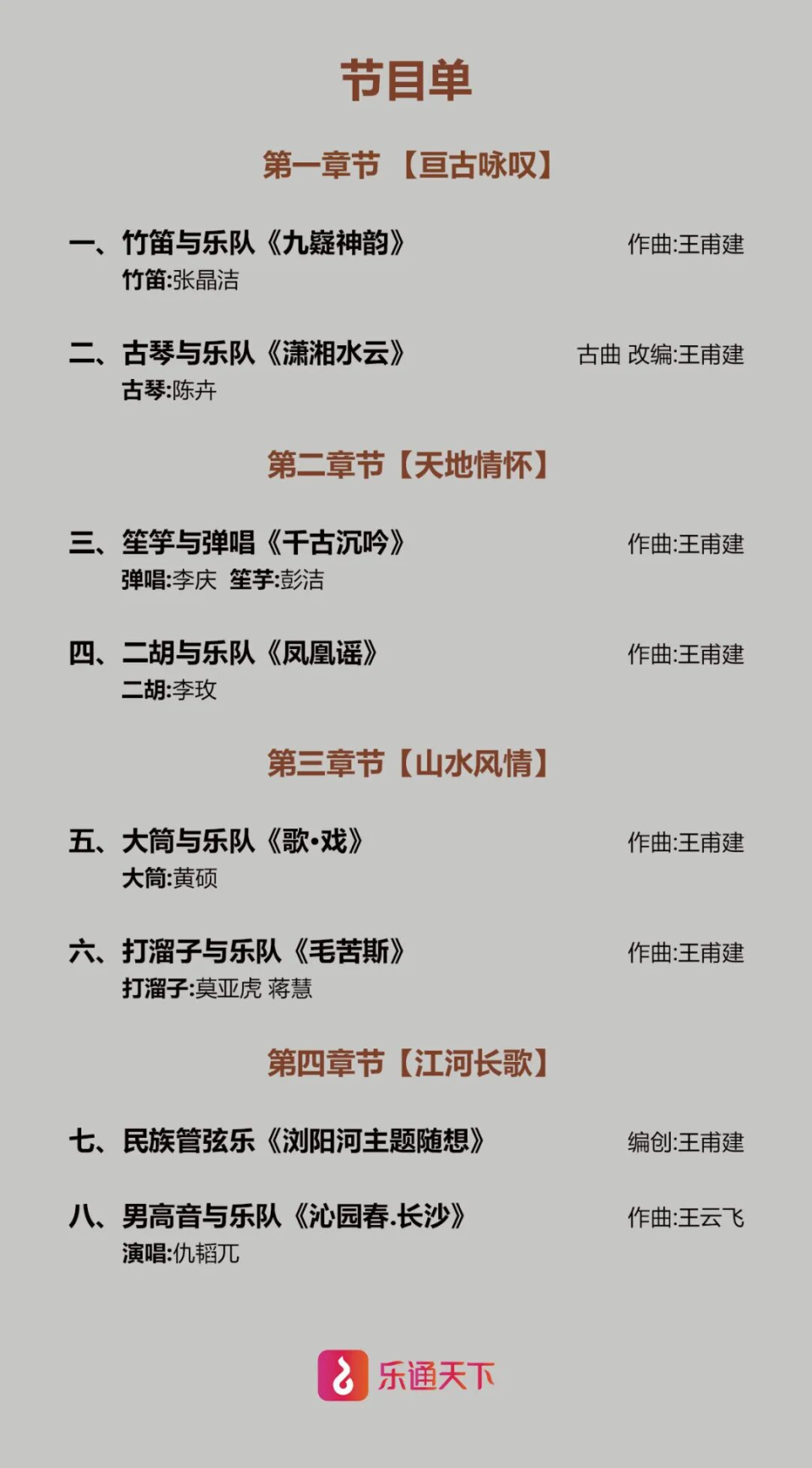 音乐会以“天地人和”为思想内涵,以“风、雅、颂”为审美追求,曲目创作上在遵循历史、文化、语言等民族音乐自身属性的基础上传承并创新。涵盖自远古舜尧传说至红色江山精神的优秀传统文化传承,是中华民族千秋万代、生生不息的写照。共分为《亘古咏叹》、《山水情怀》、《山水风情》、《江河长歌》四个篇章。通过不同的乐器、乐曲、不同的表现形式来讲述山河之恋、家国情怀和湖湘精神。不仅彰显湖南深远的历史人文风貌,更展示了湖南代代相传丰富的非物质音乐文化遗产,湖南最具地域特色并传承悠久的民间及地方戏曲音乐以及湖南以毛泽东同志为代表的红色文化传统。音乐会您将听到乐器最质朴的声音。秉承传统并致力创新,将取大自然之精华,增添竹、土、瓷等原生态乐器,使音乐返璞归真。用心聆听古老的音律诠释中华民族的千年文明,感受湖湘大地的人文情怀,诉说湖南故事,呈现大美潇湘。
