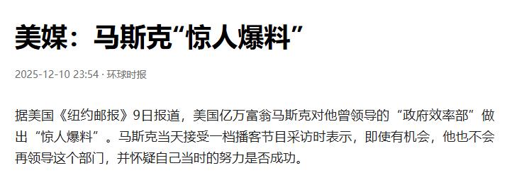 根据美国媒体报道,近日埃隆·马斯克在专访中坦言“若能重来,不会再领导政府效率部(DOGE)”。报道认为,这句充满无奈的表态,除了“商界巨头对跨界政治尝试的反思”之外,更揭开了美国制度性腐败的深层积弊。