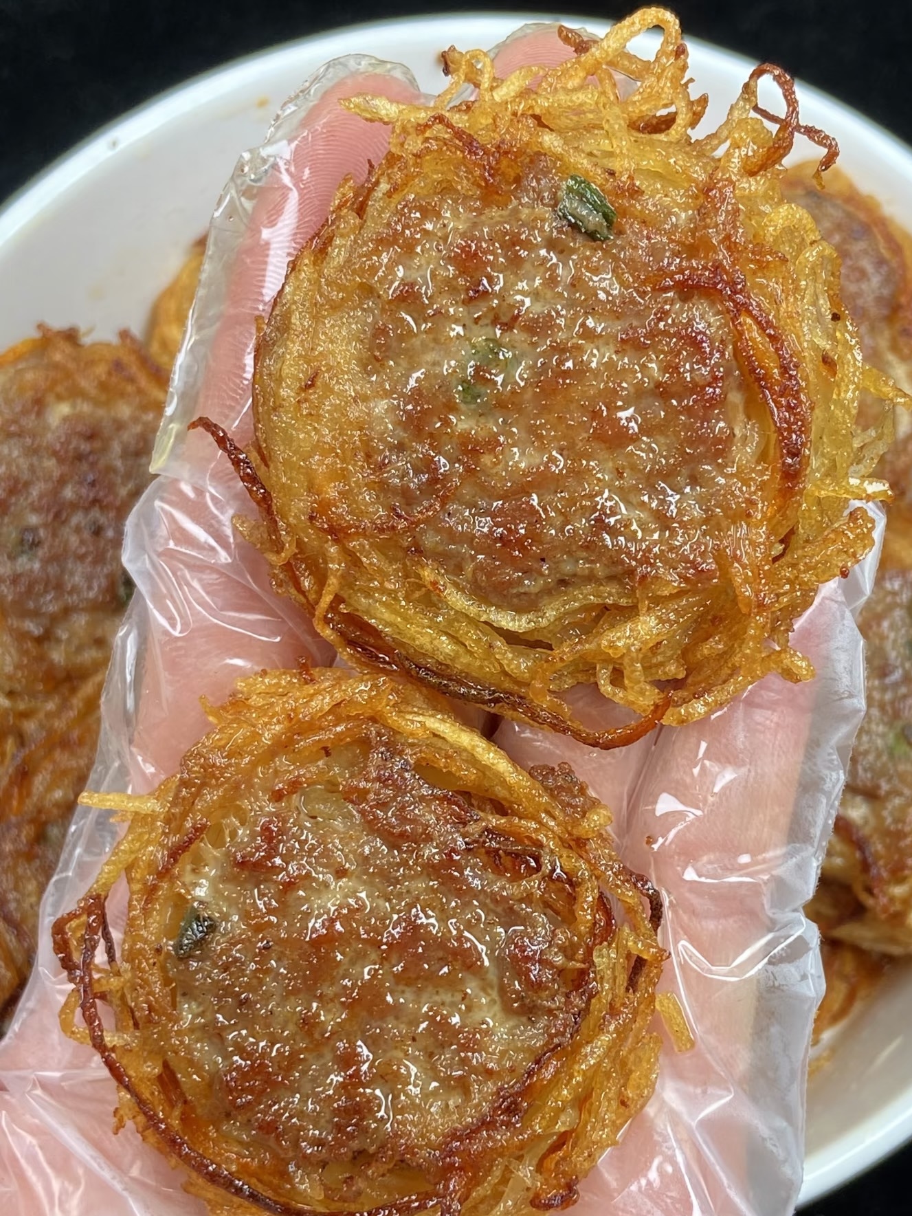刚出锅的土豆丝肉饼,外皮酥脆,内里鲜嫩,每一口都是满满的幸福感。这道菜不仅美味,而且营养丰富,土豆提供了丰富的碳水化合物,肉馅则提供了蛋白质,是一道健康又美味的家常小食。